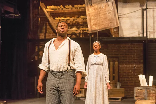 The script, unconventionally, is mostly a collage artfully assembled from direct quotes from found sources ranging from slave narratives to modern scholarly studies. John Henry (played by Freeland) and his wife, Polly (Flowers), traverse a landscape of the Reconstruction-era South where what’s being rebuilt is the machine that turned the slavery on which America’s wealth was founded into inmate labor and other forms of exploitation of African Americans. That machine is embodied by the characters of The Engineer and The Mechanic, some of whose dialogue is drawn from the book Science of Mechanics. The plentiful music, composed of excerpts and iterations, all a capella, of the oft-sung folk song “John Henry,” comes courtesy of musical direction by Caroline Wazenegger. The play’s full-length version also features a new character, Lucy (Linda Haston), a later version of Polly who serves as a narrator.