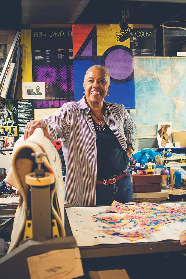 Generations of students at Pittsburgh’s High School for the Creative and Performing Arts (CAPA) knew Jo-Anne Bates (pictured) as a teacher and chair of the school’s art department. But Bates is also an accomplished artist, with solo exhibitions at venues from Massachusetts to West Virginia. And this week, she claims another accolade with the opening of her exhibit as Pittsburgh Filmmakers/Pittsburgh Center for the Arts Artist of the Year. Bates, primarily a printmaker, is active with local arts groups including the Pittsburgh Print Group, Women of Visions, Inc., and Associated Artists of Pittsburgh. Her Artist of the Year show, Exploration of Color, includes 40 new abstract, mixed-media prints of varying sizes that reflect her experiences as a woman, mother, grandmother and educator. Working in her home studio, in Point Breeze, she has used her shredded junk mail to create the colorful works, which often employ text to emphasize themes of social injustice; one is titled “Black Lives Matter 2,” another “Black vs. Blue Don’t Shoot.” The lone installation work, says Bates, incorporates donated footwear to communicate the message “Don’t judge me until you’ve walked in my shoes.”