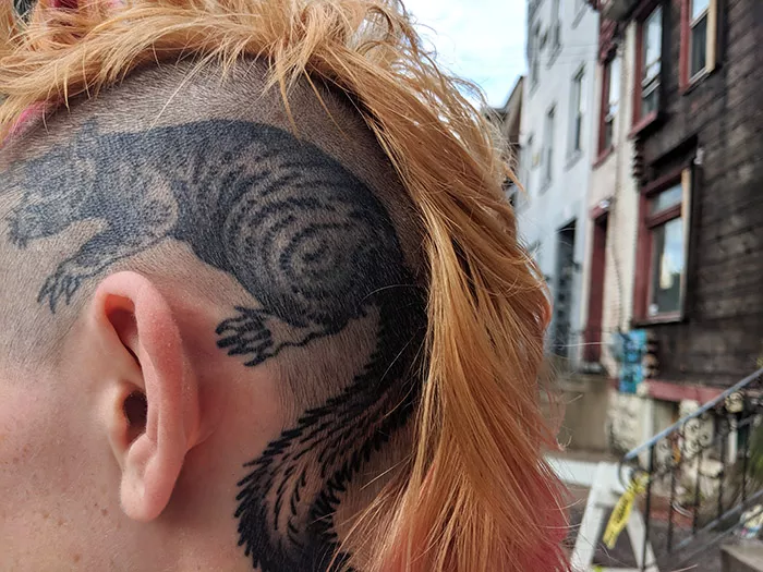 Ricky’s scrawled graffiti matches Dig’s aesthetic, whose body itself is a work of art. Their hair, a mix of blonde and red, has been shaved into a combination of a mullet and a mohawk; on the left side of their skull, a giant black tattoo of a squirrel, its tail wrapping down to the back of their neck. A bullring piercing peeks out from the bottom of their nose, and other smaller graffiti-esque tattoos decorate their arms and legs, including one that reads “gay garden.”