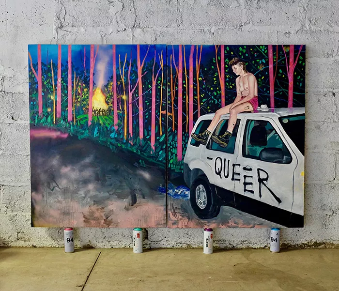 Dig and Ricky have also been turned into a similar piece of artwork. Massachusetts artist Danielle Klebes created a beautiful oil painting of a topless Dig sitting on top of Ricky, their black boots resting just above the “queer” letters.