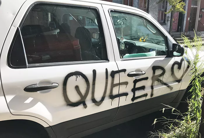 Concerned Pittsburgh residents have taken to social media to warn neighbors of a possible hate crime: “Queer” has been spray-painted on a car. Q-U-E-E-R is spelled out in giant capital letters on the right side of a white 2006 Ford Escape, the word spanning nearly the entire length of both doors; black paint drips down from almost every letter including the second “E,” shorter than the rest, leaving room for the front door handle above it unblemished.