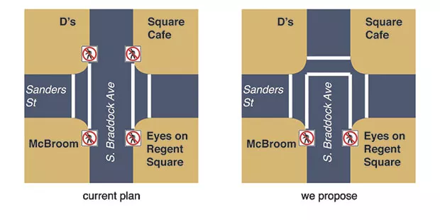 Right now, the boroughs plan to install signs prohibiting the crossing of South Braddock Avenue at Sanders Street. But Heckbert says that since foot traffic to nearby businesses has increased, many pedestrians might not want to walk an extra block to cross at an intersection with a crosswalk or stop signal.