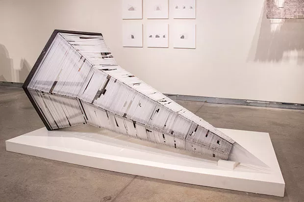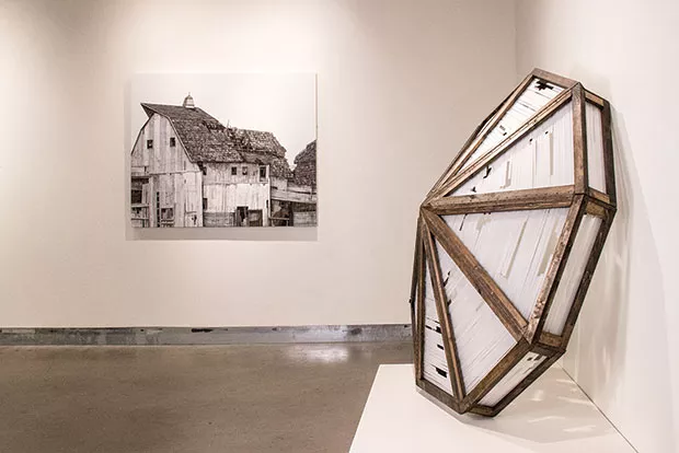 The show also features three of Clark’s “barn” collages depicting structures in varying states of collapse. From three steps away, these large-scale works look like paintings, but really they are cunning mixed-media assemblages of paper and other fibers, variously marked, textured and colored with charcoal, pastel, acrylic and graphite. Each shingle on each decaying barn is handcut, echoing the shingles on many of this exhibit’s pieces done in glass and wood; Clark’s collages memorialize leaning walls and caved-in roofs while palpably evoking sun-silvered wood and bleached-out siding.