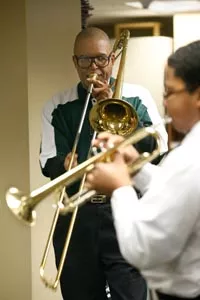 The band seems to hit a comfortable groove, but he stops the music, pointing out that the rhythm section has rushed the tempo. He directs the students in a lighthearted but expectant manner, repeatedly reminding them to “get inside the bubble,” his metaphor for the ensemble.