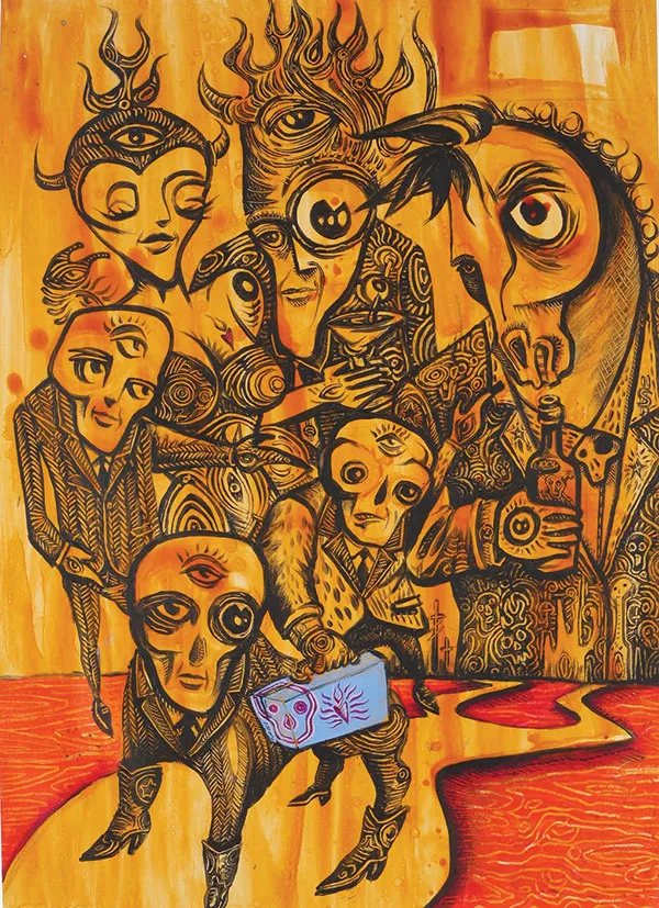 I first saw Rick Bach’s work as a college student sitting on a Mad Mex barstool in Oakland. During the long journey to the bottom of an oversized margarita, I noticed bug-eyed faces leering from the paintings on the wall — part Día de los Muertos and part surrealist comic strip. I remember thinking that the art was at once lighthearted and, well, mildly disturbed. Like an adult cartoon.