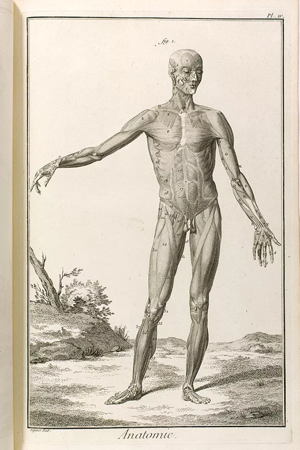 One of the show’s great pleasures is its juxtaposition of disciplines and eras. For example, Cowpers’ The Anatomie of Human Bodies (1698), with its still-shocking illustrations of flayed corpses, is displayed near Cellarius’ Harmonia macrocosmica (1660), by which the author aims to illustrate the universe on large, two-page spreads of swirling celestial diagrams. Cesare Cesariano’s 1521 version of the Vitruvian Man, less evocative than Leonardo’s famous iteration, but remarkably authentic, makes the logical connection.