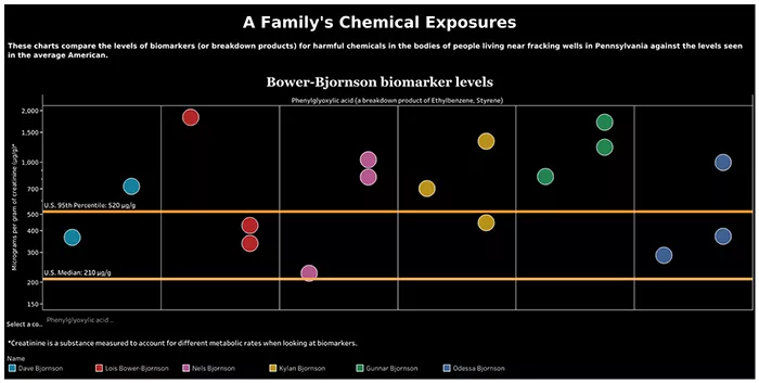 “More than half of the family’s samples exceeded the U.S. 95th percentile for phenylglyoxylic acid, a biomarker for ethylbenzene and styrene, and 41% of the family’s samples exceeded the U.S. 95th percentile for hippuric acid and trans, trans-muconic acid — biomarkers for toluene and benzene, respectively. Exposure to these compounds is linked to skin, lung, and eye irritation; central nervous system, liver and kidney damage; and cancer,” reads part 1 of Marusic’s investigative series for EHN.