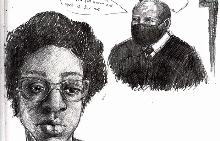Kharabi got involved with ALC’s court-watching program in January 2021, shortly after graduating from Carnegie Mellon University. An artist, Kharabi was drawn to a post requesting a volunteer sketch artist to produce images of people and events in the courtroom, since cameras are not allowed.