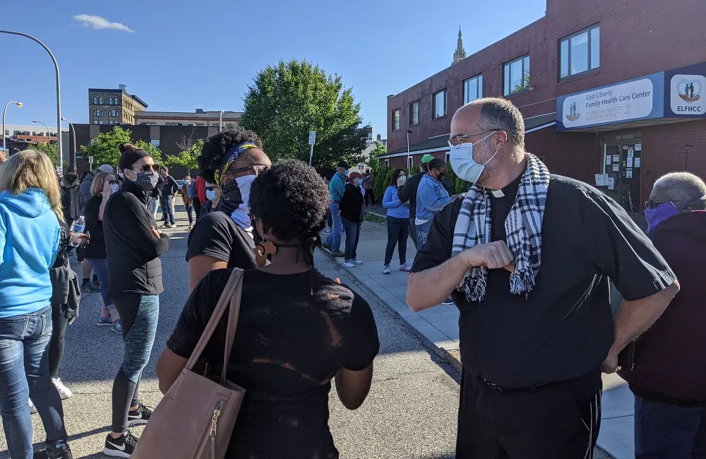 He cited the fear he, as a white clergy member, sees in his own Black parishioners and called out the need for justice in the case of Floyd. He also cited the cases of Antwon Rose II, a local Black teenager who was fatally shot in June 2018 by former East Pittsburgh police officer Michael Rosfeld, and Ahmaud Arbery, a 25-year-old Black man in Georgia who was chased down and killed in February by two men claiming to be making a citizen’s arrest.