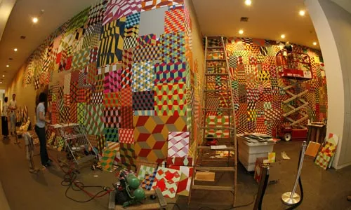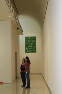 Life on Mars contributing artist Barry McGee works in an often-overlooked hallway that leads to the Museum of Art’s administrative offices, just around the corner from one of the security desks. His work itself is a dizzying array of brilliantly colored Op Art panels, cut to various sizes. In places, the wall itself bulges, projecting into the hallway. The effect is almost dizzying, an optical illusion that really is pushing beyond the flat surface.
