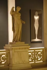 The Hall of Sculpture’s second-floor balcony, meanwhile, is lined with reproductions of classical statuary, and it’s become an International tradition to find artists who can carry on a dialogue with these figures. Fogle continues the tradition with a series of large black-and-white photograms created by Bruce Conner in the 1970s. Conner created the works, titled ANGELS, by posing in front of light-sensitive paper. The resulting images are ghostly, with only the artist’s hands — often spread in a gesture of supplication or warning — sharply defined. Spiritually charged, the images recall the Shroud of Turin, and like the statues on the balcony, they capture the human form in a stark visual language.