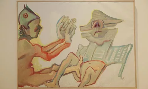 While Fogle acknowledges, “It’s a tough world that we’re living in,” he adds that none of the exhibit “is political art with a capital P. I’m not interested in haranguing the viewer.” The bulletin board in his office, after all, features a photo of the late comedian/performance artist Andy Kaufman — the exhibit’s “patron saint,” Fogle says.