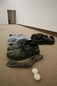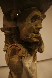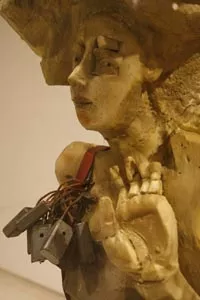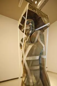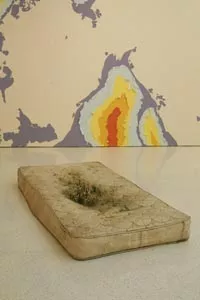 One of Hughes’ contributions involves creating the illusion that the gallery walls are peeling away, as if the museum were a badly decayed ruin. It’s an oddly festive decay, since Hughes has rendered these layers in the colors of the rainbow. But post-Katrina, it’s easy to read one of the walls as the Doppler image of an approaching hurricane. As the exhibit’s catalogue puts it, a sense of failure “permeates [Hughes’] work like a bad smell.” One of his sculptures appears to be a soiled mattress with a tiny forest of lifelike mushrooms sprouting from its seams. The mushrooms, of course, suggest both decay and hallucinogenic self-delusion … and in fact the mattress is no mattress at all, but a convincing counterfeit sculpted in resin.