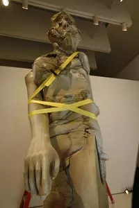 It may seem perverse to try to capture rot and decay so precisely. But there’s an archeological feeling to much of the exhibit — as if we were excavating our culture from its own ruins. Matthew Monahan’s sculptures, for example, half resemble trolls, or the unearthed caryatids from some ancient civilization. But they are carved from foam, and bound with canvas straps. These are broken idols, survivors not of the Stone or Bronze Age, but of an Age of Plastic.