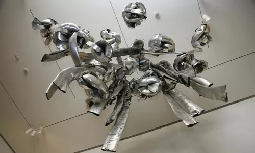In any case, though these works are made from humble materials, there’s nothing modest about their ambitions. Consider Marisa Merz’s stunning sculpture in the ground-floor Forum Gallery. A tangle of sheet metal hangs from the ceiling, draped and folded like some strange postindustrial mollusk, or a flight of angels rendered in ductwork.