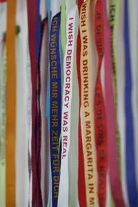 Visitors will be invited to take a ribbon in exchange for leaving a wish of their own. And some of those wishes will be incorporated into future showings of the work. “I Wish Your Wish” is an organic, growing thing, expressing human longings in various languages, speaking with voices both unique and universal.