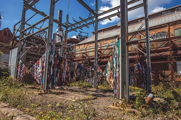 Hidden histories were reclaimed. “paradox, 1901,” by Laurie Barnes, uses a bed-form filled with objects associated with domesticity to allude to the off-site homes and spouses of the workers. Edith Abeyta’s “How We Slowly Become History” features masses of colorful, richly textured clothing woven into triangular forms to connect architecture and industry, time and memory, and human presence. Faced with the scale of the mill, Ryan Keene’s strategy was to contrast through small scale, with miniature vignettes in “Sketches: Production” positioned throughout the core of the mill. Depicting families stalked by wolves, it’s a profound riff on a history fading from awareness, namely, of the pressures resulting from the demand for the ceaseless production that was Carrie Furnaces’ reason for being.