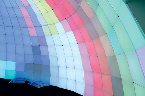 Plume is a triumph of sound and light, a revelatory immersion that captures viewers and entices them beyond observation into participation. Constructed of tile blocks of white plastic, the rounded structure’s roof arcs toward the ceiling, while a curved portal reveals a cozy interior where pillows scattered on the floor invite you in. While the pale, sloping dome at first suggests a frigid igloo, what it more accurately evokes is a sweat lodge — not because it physically resembles a smoky, incense-laden shack, but because it possesses the capacity to transform.