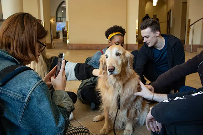 At least five students are petting Brooke at once as she visits Point Park University during midterm exams. The Golden Retriever is a part of Campus Canines, a group of about 60 volunteer dogs (and their humans) who have been helping to alleviate the stress of college life at local campuses for the past 18 years.