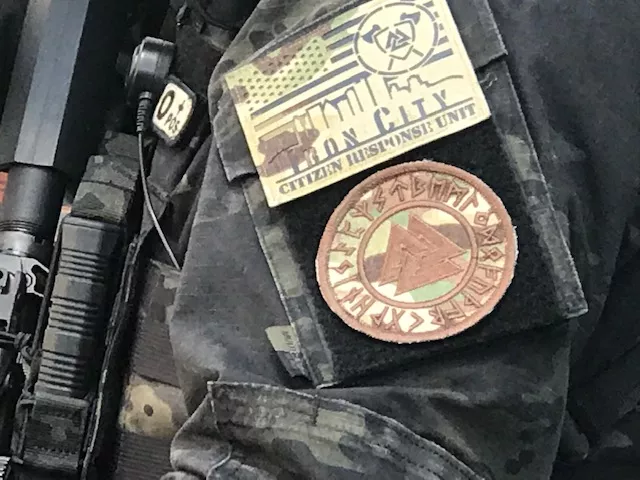 The protest started at noon and about 20 minutes in, a group of armed civilians joined the protest. The 10 or so armed civilians identified as the Iron City Citizens Response Unit, and most of them wore patches with the group’s insignia. Part of that insignia includes a symbol of three interlocking triangles called the Valknot, or Valknut. Some members of the Iron City Citizens Response Unit also wore separate patches that had larger versions of the Valknot.