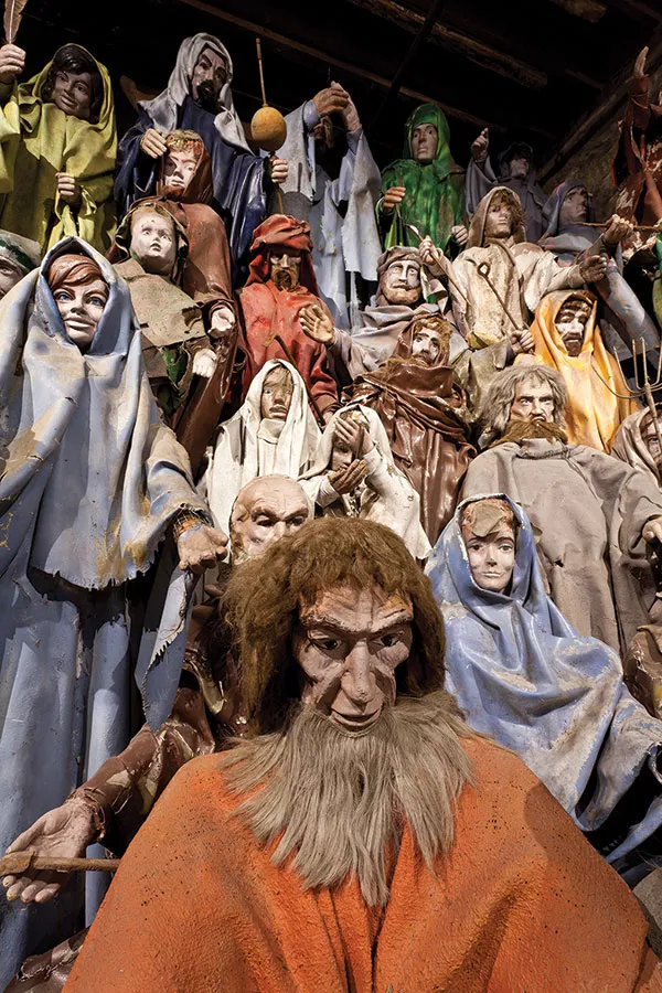 The back of the room, meanwhile, features an assortment of found objects from two dilapidated Michigan tourist traps. Along the back wall is a choir-like formation of 4-foot-tall figures from a Bible theme park. (Imagine the generic robed people found in an illustrated children’s Bible.) Peppered throughout the scene are dinosaur figurines. The juxtaposition calls to mind the much-mocked Creation Museum, in Kentucky. Hocking, however, is not making a direct commentary. “I see the room as a mix of symbols you would see if you dug up our society and saw it raw,” he says.