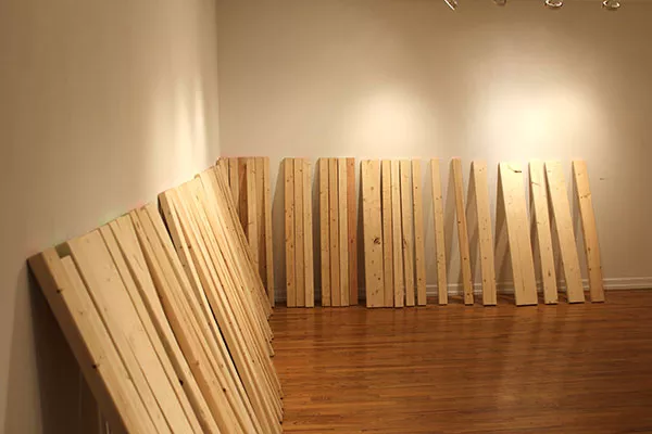 Olsen’s utilization of the same primary elements takes them on an utterly different path. Lumber is stacked against the gallery wall, 2-by-4s of varying lengths, their upward ends festively painted. On other walls, cardboard has been mounted several inches out rather than flush, its inner side similarly colored. Underneath the ordinary lighting of the gallery, the tints bounce against the plain, flat white of the walls. The eye is tricked, perceiving additional luminosity that is really only the reflection of the coated surfaces. We’re also fooled by the lush quality of the hues into bestowing movement and vibration.