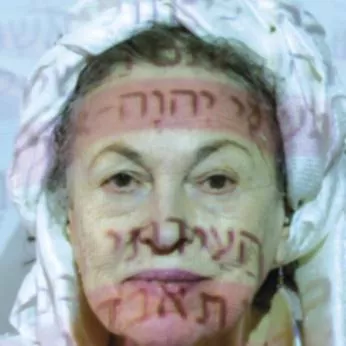 In her photographs “Self Portrait: The Unmentionable” (2010), she projects, across her forehead, the Hebrew script for God — a word so holy, it is replaced in religious texts with “The Unmentionable.” The image is repeated five times, corresponding with the Torah’s five books, or Pentateuch.