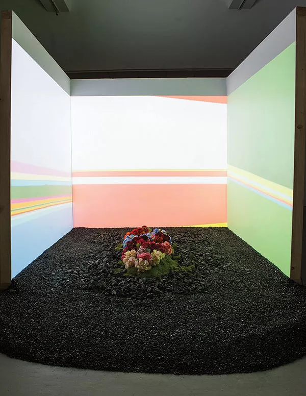 A counterpoint to nature’s unpredictable flux is the human pursuit of perfection through cultivation. In “Summer Flower Border,” Tony Heywood and Alison Condie have created a “horticultural installation” that considers the colors of cultivated flowers. Using a swatch from the color chart used to classify new species, the artists create a matching paint that they then pour onto canvas and capture on video. The installation combines components both real (anthracite) and artificial (fake flowers, lights, projections, a musical score) that come together to form an alternate portrait of landscape. Resembling a psychedelic grave, the piece combines aspects of abstraction and still life in order to explore changing notions of landscape as well as mimicry and stasis.