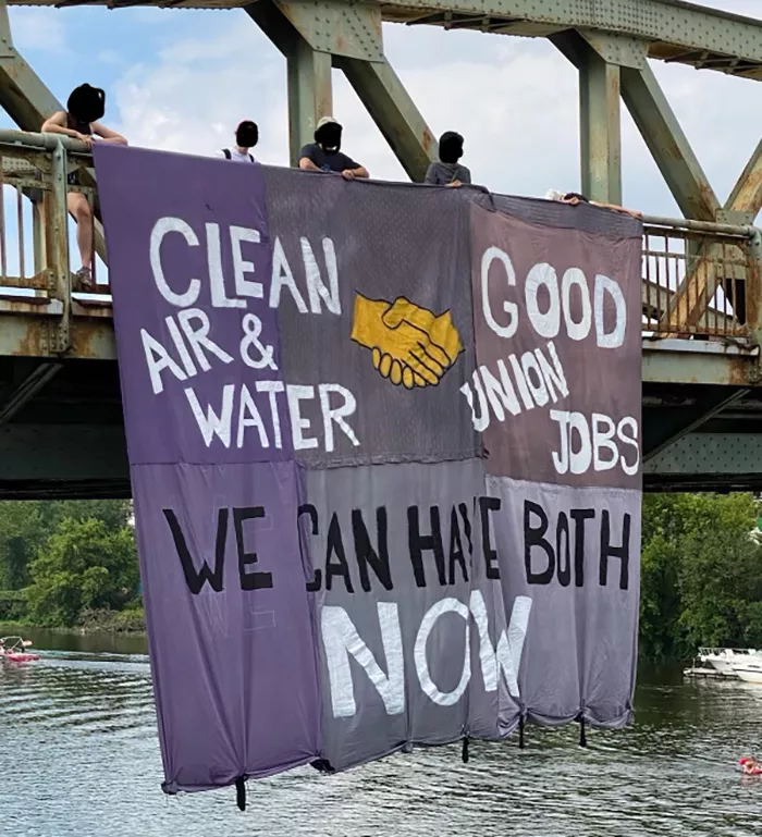 A banner the size of a small studio apartment hung from a bridge over the Ohio River this weekend. Its message read: “CLEAN AIR & WATER-GOOD UNION JOBS-WE CAN HAVE BOTH NOW.”