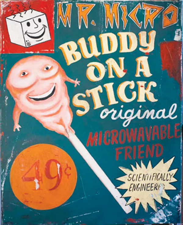 Whatever the inspiration, the work — showing concurrently at New York City’s venerable O.K. Harris Gallery — is both lowbrow and sophisticated. The paintings capture, in a funny, fantastic way, unspecified periods of Americana. The banners and ads appear real at first. But, like a sideshow, it’s all a scam, and we will be fooled into entering by appeals to both our eccentricity and our need to conform.