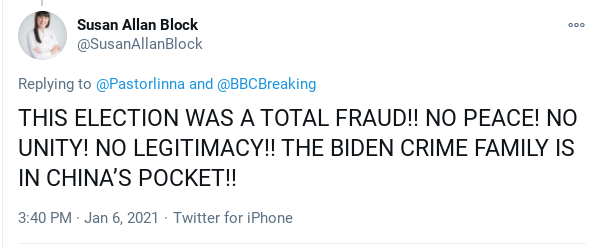 Another social media post by Block was made yesterday afternoon, just as the news of the insurrection was breaking. Block wrote in a tweet in all caps, “THIS ELECTION WAS A TOTAL FRAUD!! NO PEACE! NO UNITY! NO LEGITIMACY!! THE BIDEN CRIME FAMILY IS IN CHINA’S POCKET!!,” parroting right-wing conspiracy theories that Biden is tied to the Chinese government.