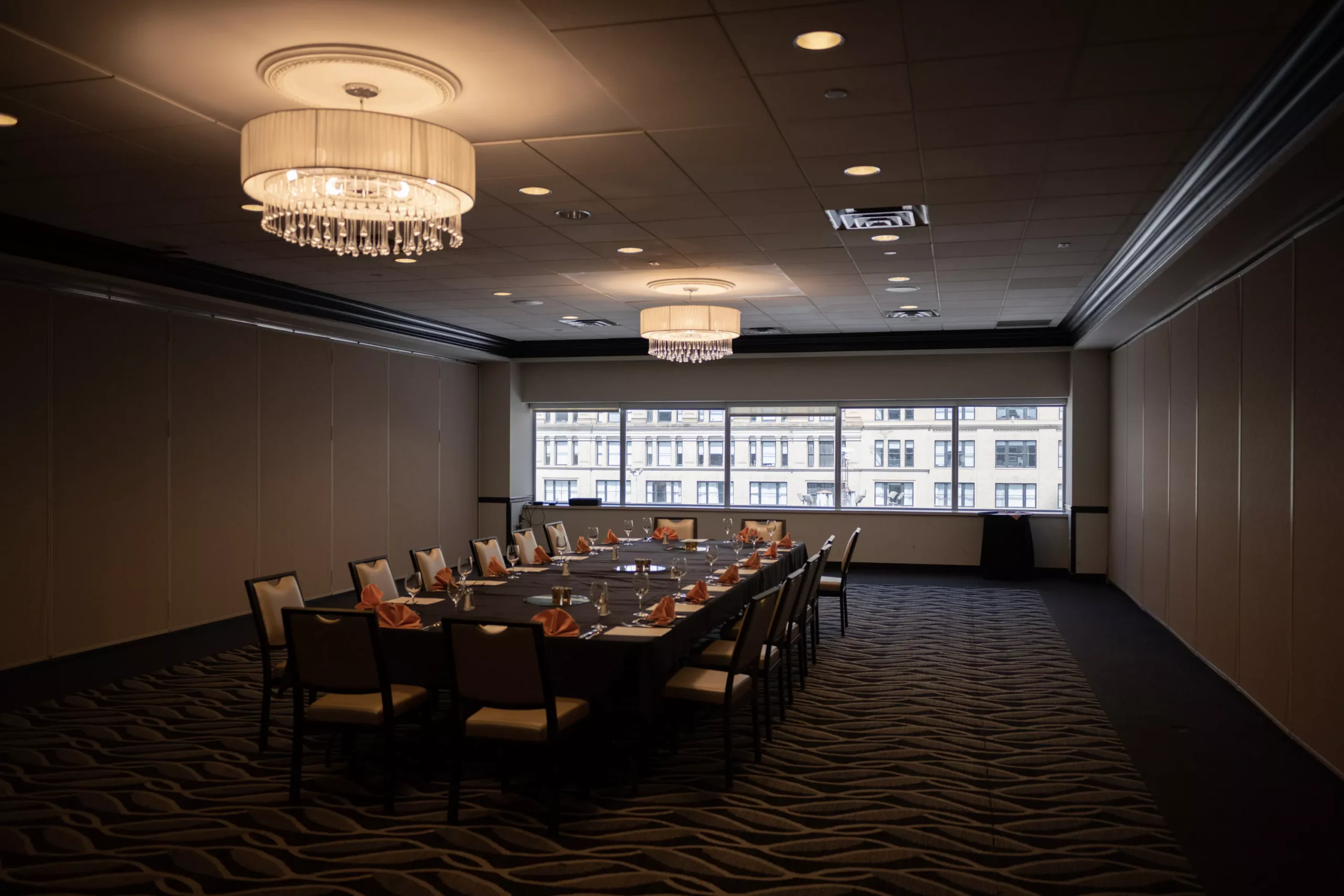The Duquesne Room, formerly named the Crystal Room after its collection of chandeliers that were recently taken down and “meticulously cleaned” piece by piece, Liberi says, is sought after for its formal dining with a live pianist. It offers views of the Trinity Cathedral churchyard across the street, home to some of the oldest marked graves on the East Coast.