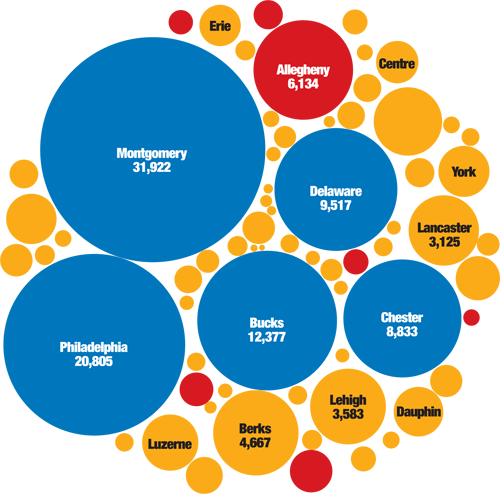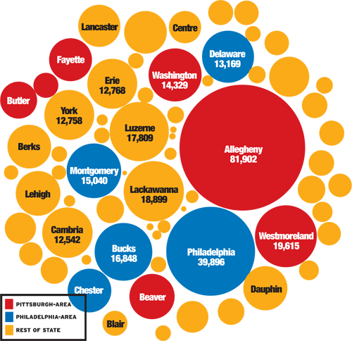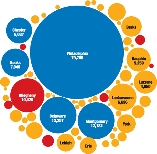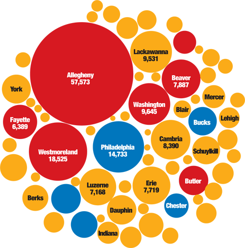 Chris Briem, a regional economist at the University of Pittsburgh’s Center for Social and Urban Research, broke down the Democratic primary results using “Many Eyes,” an online data-visualization tool. In the charts that follow, each bubble is proportional to the number of votes the candidate earned in a given county. Counties are also color-coded according to their geographic region: within the Pittsburgh metro area, near Philly, or anywhere in between.