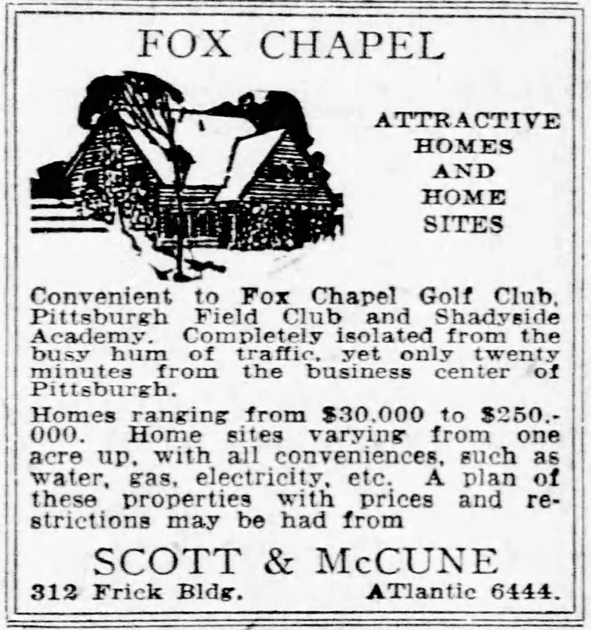 Fox Chapel Manor, created in 1924, was the first subdivision inside the future borough’s boundaries. Its developer, Walter A. Scott (the current mayor’s grandfather), required new homes to cost at least $15,000 ($269,000 in 2024) and be reviewed by three architects, including one selected by the Pittsburgh Real Estate Board.