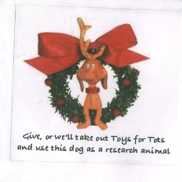 The card has numerous, detailed accents: It’s printed on laminated card stock and in color; it contains a smaller card and return envelope addressed to the hospital’s foundation; and a sticker on the back of the envelope features the Grinch’s dog Max, threatening “Give, or we’ll take out Toys for Tots and use this dog as a research animal.”