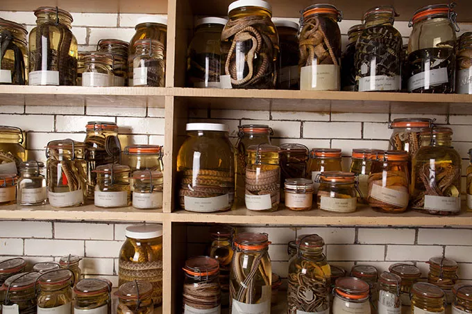 A few noticeable differences include the entry hallway, which used to house metal tanks containing the museum’s collection of North American freshwater turtles, the largest in the world. Because the museum expanded the number of tanks and moved them, that hallway has been converted into what Kennedy-Gold calls a “little exhibit space” where guides will start tours with a brief history of herpetology and how herpetologists have collected specimens over the years. This means visitors will see some tools of the trade, like antique microscopes and anti-venom kits, as well as a sneak peek of the 250,000 Alcohol House specimens from all over the world, including jarred and mounted taxidermy specimens, bones, and molds and casts.