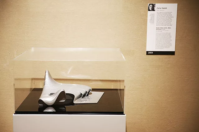 Here, the sense of multiple perspectives on the exhibit is especially acute. Hadid’s Azerbaijan project memorializes a repressive dictator, the government forcibly evicting residents so the building could be constructed.