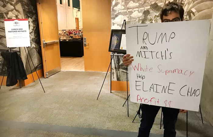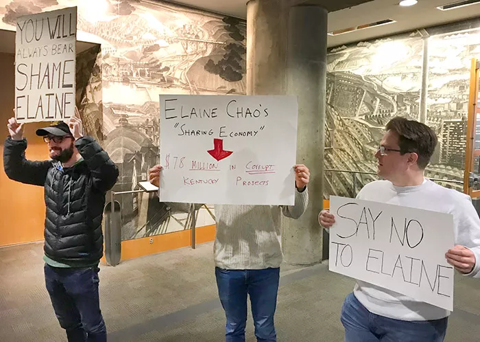 Zachary Clein, a grad student in dramatic writing, said the group gathered to protest Chao’s alleged corruption and her reign as U.S. DOT secretary, which they criticized for not boosting public and alternative transportation sufficiently.