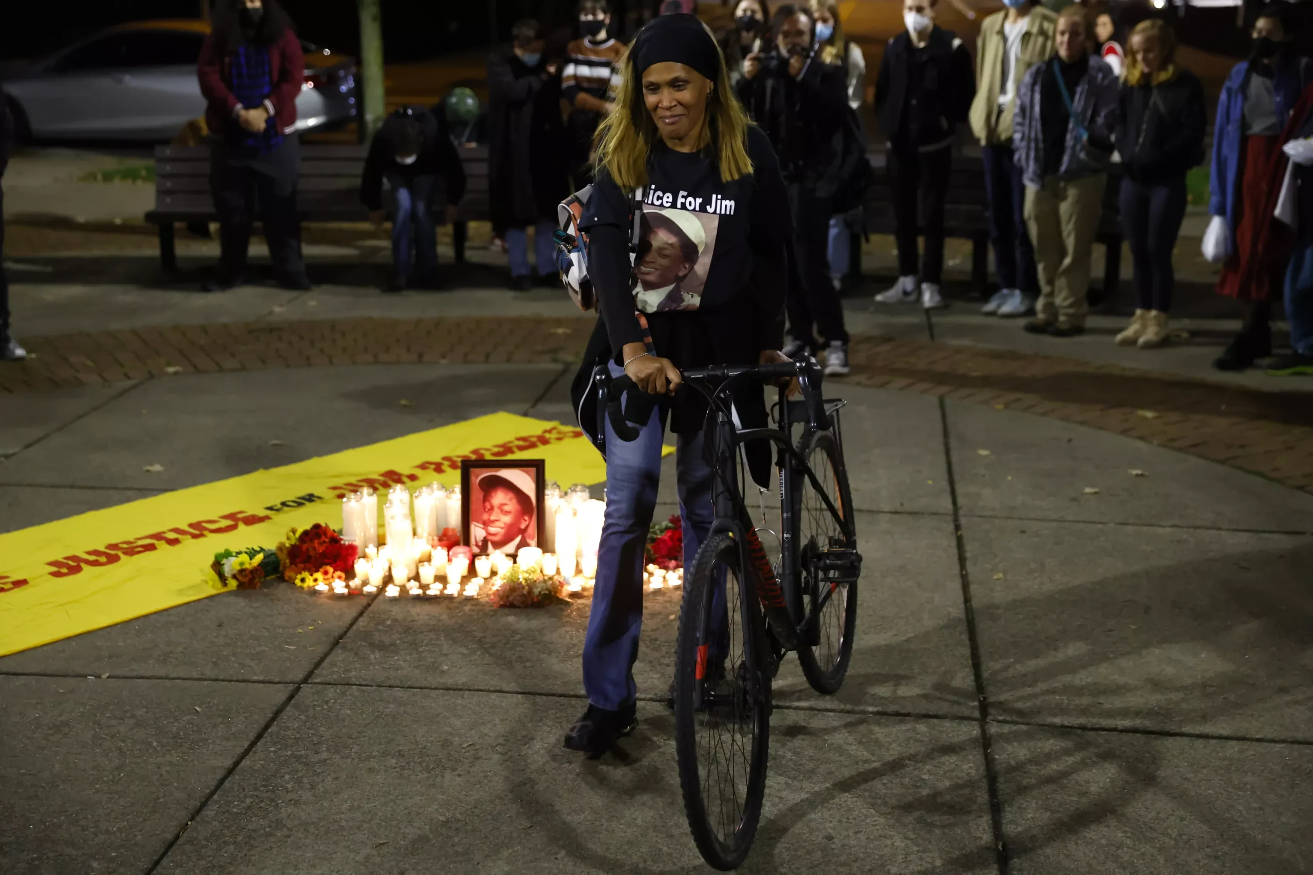 Jim Rogers’ sister-in-law, Tiffany Hale, walks her bike past the candlelight memorial inside Friendship Park. Credit: CP Photo: Jared Wickerham