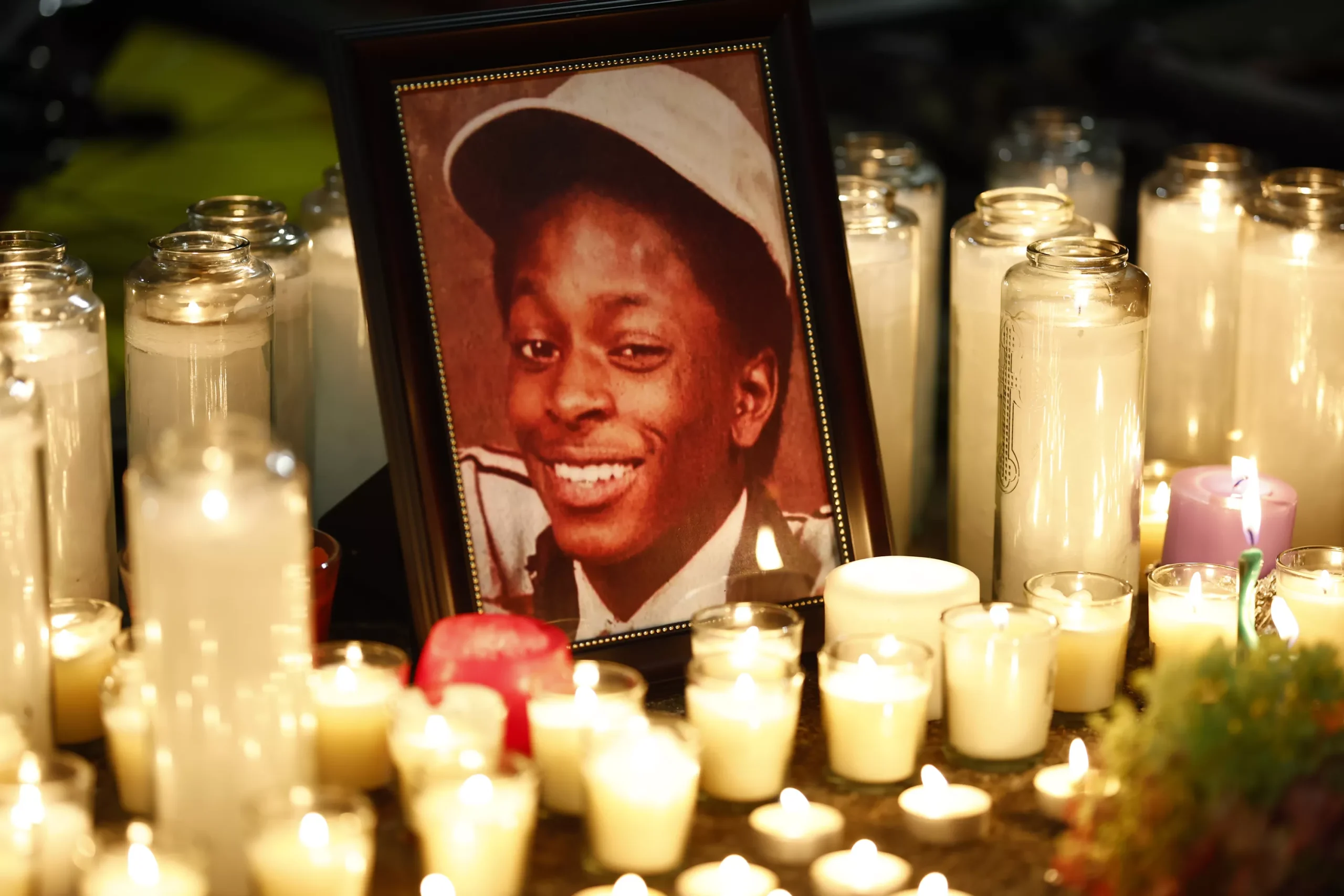 Supporters leave lit candles and place flowers in front of a photo of Jim Rogers in Friendship Park after marching through the streets a year following his death. Credit: CP Photo: Jared Wickerham