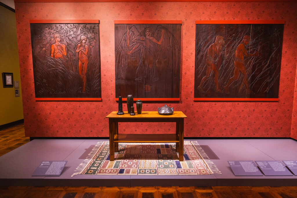 Some of the art featured in the David and Susan Werner Collection, now on display at The Frick Art Museum as part of The Scandinavian Home: Landscape and Lore exhibition. Above the table are three wooden panels by Stephan Sinding. From left to right, the panels are called “Adam Eating the Apple with Eve and Snake,” “Archangel Michael and the Sword,” and “Expulsion from the Garden of Eden.”