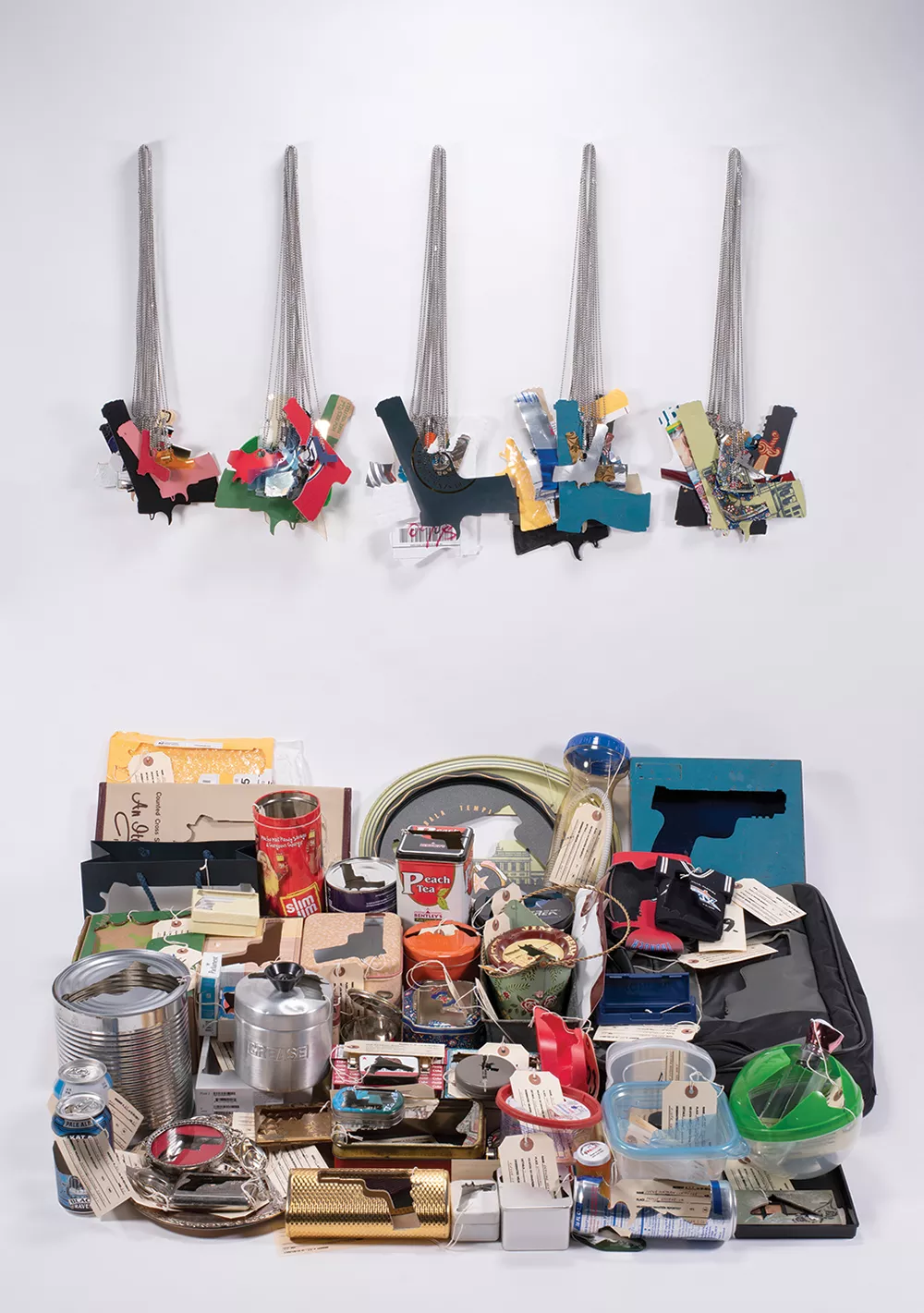 Cameron researched fatal gun incidents that occurred on January 1, 2017, through the nonprofit Gun Violence Archive. She found 62 occurrences in 55 locations involving 66 guns, affecting 73 people in that one day. Cameron dug deeper and found the weapons used, and collected metal, plastic, fabric, or paper containers from those 55 places. After matching a container to the corresponding weapon, she cut an outline of each gun that rendered the vessels useless.