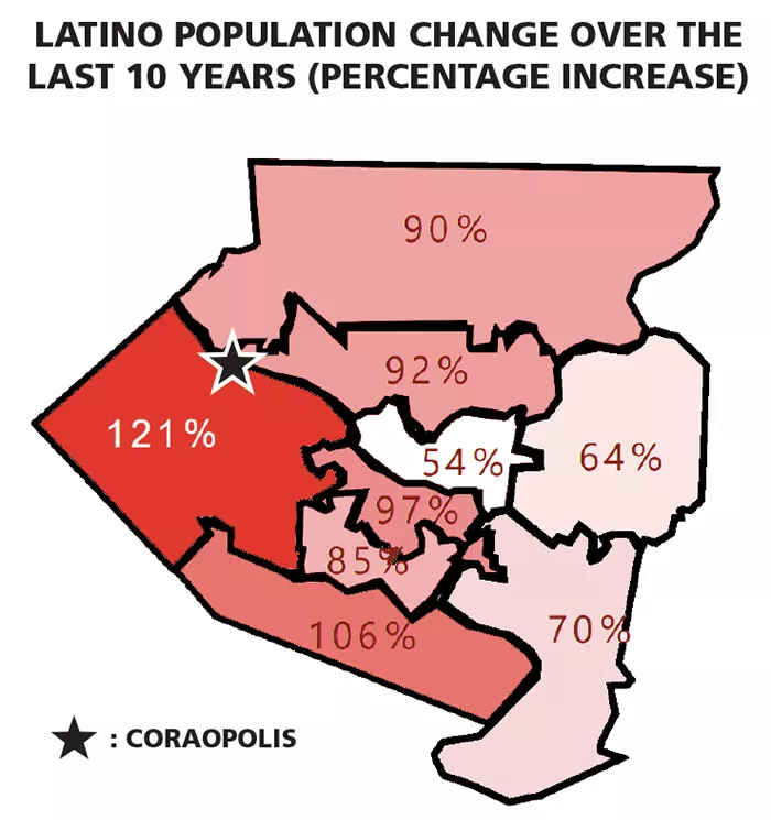 According to census data, the Latino population in Coraopolis leaped from around 100 residents in 2010 to nearly 350 in 2020, while across the county, the rate of growth has been far slower.