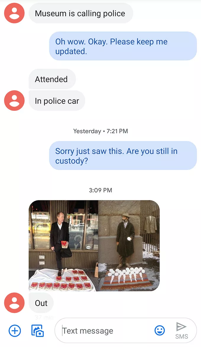 This was quickly followed by a photo of them posed with a colorful array of crocheted penises and two more texts — “Museum is calling police” and “In police car.” As of this afternoon, a text containing a strange image read that they had been released.