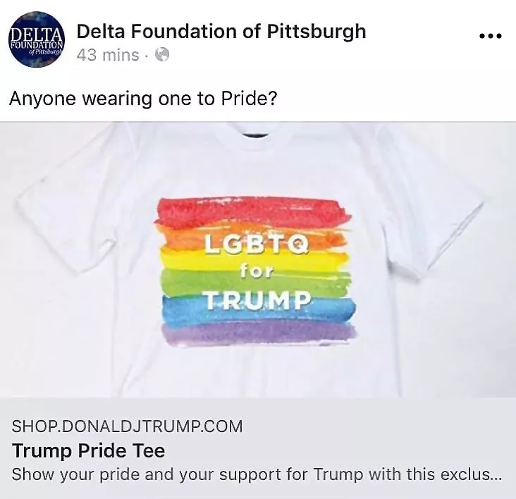The Delta Foundation of Pittsburgh, the region’s largest LGBTQ advocacy organization, came under fire today after posting a link on Facebook showing a T-shirt emblazoned with the words “LGBTQ FOR TRUMP” over a rainbow. Delta asked in the post, “Anyone wearing one to Pride?”