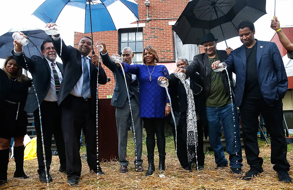 After speeches, members of the August Wilson House board and Washington blessed the ground with a libation ceremony. Each board member gave a blessing and poured their drink onto the ground. Washington went last.