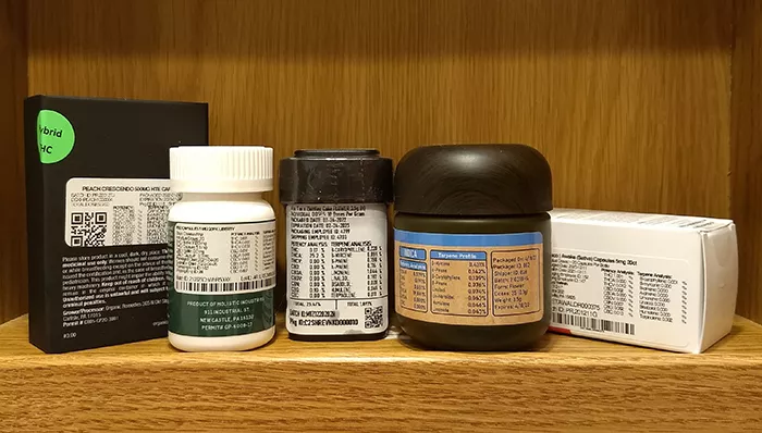 Cannabinoids are also sometimes listed as “Potency.” These are chemical compounds “that interact with endocannabinoid system receptors in the brain and body to produce various effects,” according to a Delta 9 brochure. This is where you’ll find levels of THC and CBD.