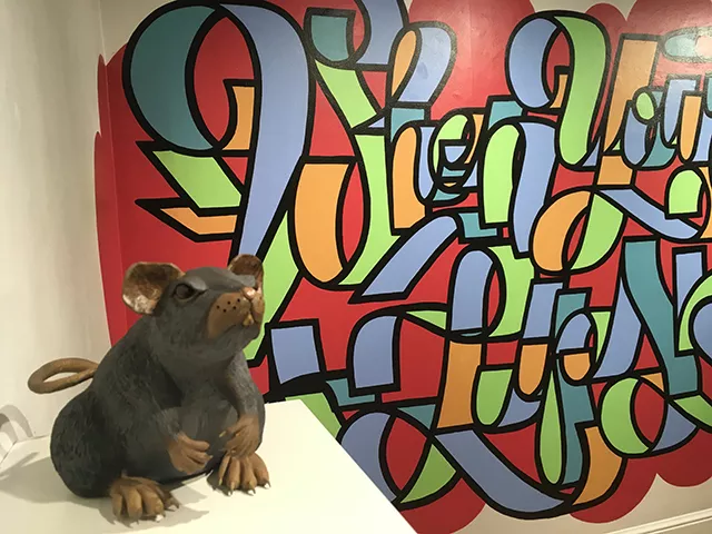 A distinct sense of whimsy characterizes Distilled, the latest exhibition at the Pittsburgh Center for Arts and Media (formerly Pittsburgh Center for the Arts). Woven throughout 82 works by 42 members, teaching artists, and staff are touches meant to delight and surprise. Visitors are greeted by the candy-colored, ribbon-y text of This Magic Moment, a mural by Danny Devine spanning a back wall of the downstairs gallery area. Crocheted footprints (Self Portrait by Mary Towner) pull the room together as they spread out across the floor in the upstairs gallery, waiting to be tromped upon by those too busy eyeing the wall hangings to notice the artwork beneath their feet.