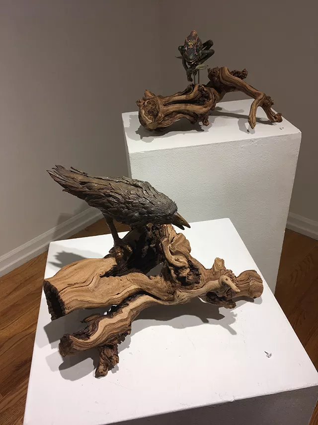 Artist Kara Zuzu makes a mark with a variety of nature-inspired ceramic and clay pieces, including the mounted animal heads of Ambition (Goat) and Guide (Hare) and the posed faux-taxidermy of Keeper of the Secrets (Raven) and Change (Chameleon), all of which call attention to the often bizarre, morbid trophy art of hunting culture.