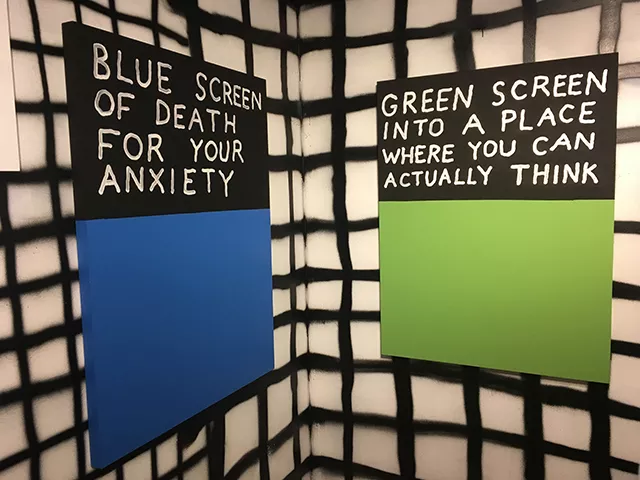 Taking up another room is TL; DR, a mural installation by Seth LeDonne. The work invites visitors into a simulated webscape with four walls covered in crudely painted gridlines and paintings that serve as ominous pop-up ads with messages like “Your Data Will Be Lost When The World Ends” and “How To Keep Paying Your Web Hosting Platform After You Die.” While TL; DR attempts to put into perspective the ephemeral, dehumanizing nature of internet life, it lacks the immersive impact and sophistication necessary to warrant taking up an entire room.